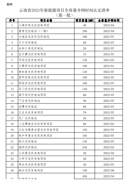 云南省能源局會(huì)同有關(guān)部門和發(fā)電企業(yè)共同確定了《云南省新能源項(xiàng)目全容量并網(wǎng)時(shí)間技術(shù)認(rèn)定指南(試行)》,并由云南電網(wǎng)公司組織開展全容量并網(wǎng)時(shí)間技術(shù)認(rèn)定工作。我局收到云南電網(wǎng)公司提交的24家發(fā)電企業(yè)共89個(gè)項(xiàng)目技術(shù)認(rèn)定報(bào)告,經(jīng)認(rèn)真復(fù)核,同時(shí)征求了云南省發(fā)展和改革委員會(huì)、國(guó)家能源局云南監(jiān)管辦的意見(jiàn),形成了《2023年新能源項(xiàng)目全容量并網(wǎng)時(shí)間認(rèn)定清單(第一批)》?,F(xiàn)對(duì)2023年第一批89個(gè)項(xiàng)目的名稱、容量、全容量并網(wǎng)時(shí)間等信息進(jìn)行公示。