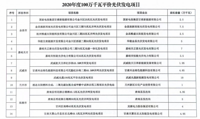 3月25日,甘肅省發(fā)改委發(fā)布《關(guān)于加快推進(jìn)全省新能源存量項(xiàng)目建設(shè)工作》的通知。文件明確,甘肅省目前新能源存量項(xiàng)目約600萬千瓦。其中,光伏發(fā)電項(xiàng)目1.23GW包括:酒湖直流工程配套23.5萬千瓦光伏發(fā)電項(xiàng)目以及《國家發(fā)展改革委辦公廳國家能源局綜合司關(guān)于公布2020年風(fēng)電、光伏發(fā)電平價(jià)上網(wǎng)項(xiàng)目的通知》(發(fā)改辦能源〔2020〕588號(hào))中尚未并網(wǎng)100萬千瓦光伏發(fā)電項(xiàng)目。