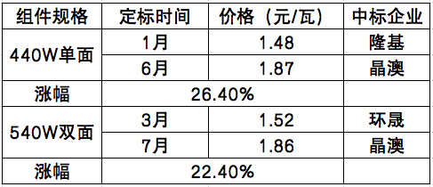 在價(jià)格方面,2021年上半年隨著組價(jià)集采的推進(jìn),組件價(jià)格受硅料上漲影響,其報(bào)價(jià)也呈現(xiàn)快速上漲的趨勢。從年初中核集團(tuán)第一批1.3GW組件集采,隆基單面450組件報(bào)出1.48/瓦元的中標(biāo)價(jià)格,到今年6月蒙能包頭50MW技術(shù)領(lǐng)跑項(xiàng)目中晶澳以450單面1.87元/瓦的中標(biāo)價(jià)格拿下上半年“標(biāo)王”,組件漲幅約26%左右。相較于去年1.55元/瓦的定標(biāo)均價(jià)而言,今年440+組件已經(jīng)來到1.7元/瓦上下;540雙面則由3月廣東電力第一批組件集采的1.52元/瓦的中標(biāo)價(jià)上漲至7月廣東電力第三批組件集采的1.86元/瓦中標(biāo)價(jià)格,漲幅約22.37%。