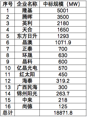 從定標(biāo)情況來看,由于部分央企采取的是框架招標(biāo),實(shí)際中標(biāo)人并未明確,在剔除此類招標(biāo)逾10GW后,明確中標(biāo)人的定標(biāo)規(guī)模約為19GW。其中,中標(biāo)規(guī)模TOP5依次為隆基、騰暉、英利、天合、東方日升;在一二線組件企業(yè)占比中,TOP6組件企業(yè)中標(biāo)規(guī)??傆?jì)為9.616GW,占明確中標(biāo)人總規(guī)模比重為51%。