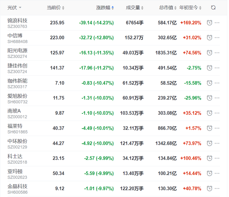作為資本市場重要板塊,光伏行業(yè)很難置身事外,超80%光伏概念股今日出現(xiàn)下跌,電氣設備板塊整體跌幅5.79%。具體看,愛旭股份、南玻A、福萊特、中環(huán)股份、科士達、亞瑪頓、金晶科技等7只股票跌停,錦浪科技、中信博、陽光電源、捷佳偉創(chuàng)、珈偉新能等5只身處創(chuàng)業(yè)板、科創(chuàng)板的股票跌幅超過10%,超30只股票跌幅超過5%,就連光伏ETF(SH:515790)也罕見地出現(xiàn)6.98%下跌。