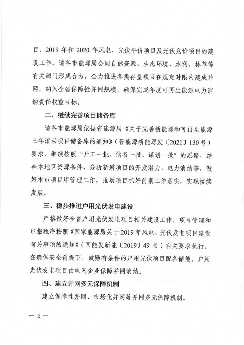 結(jié)合山西省非水電消納責(zé)任權(quán)重最低值,經(jīng)電網(wǎng)公司測(cè)算,2021年、2022年山西省需新增風(fēng)電、光伏發(fā)電并網(wǎng)規(guī)模1120萬千瓦。文件明確晉北三市暫不考慮風(fēng)電競配項(xiàng)目,其余地市風(fēng)光發(fā)電項(xiàng)目規(guī)模按2:8比例申報(bào)。