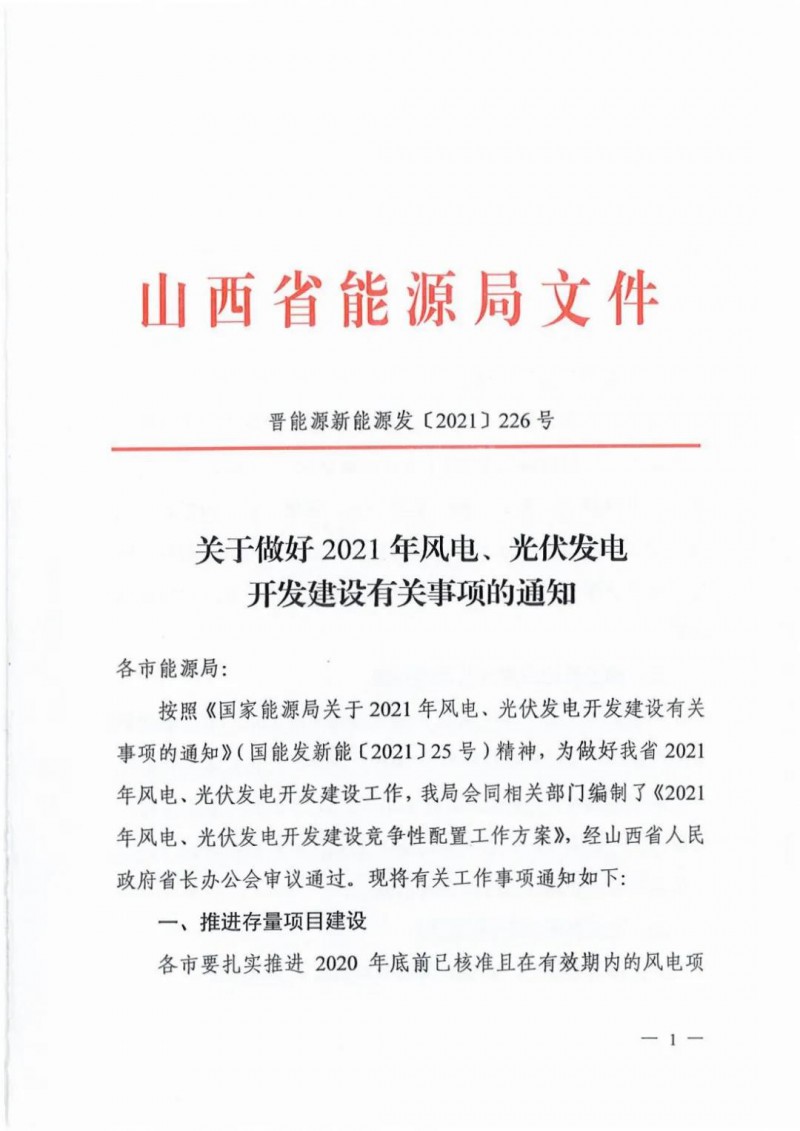 8月26日,山西省能源局印發(fā)《關(guān)于做好2021年風(fēng)電、光伏發(fā)電開發(fā)建設(shè)有關(guān)事項(xiàng)的通知》。通知中對(duì)山西省的2021年的光伏、風(fēng)電工作做了規(guī)劃。
