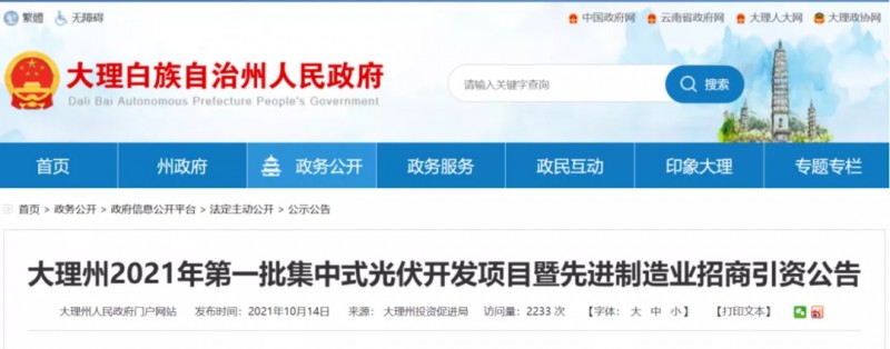 大理州2021年第一批集中式光伏開發(fā)項目暨先進制造業(yè)招商引資公告