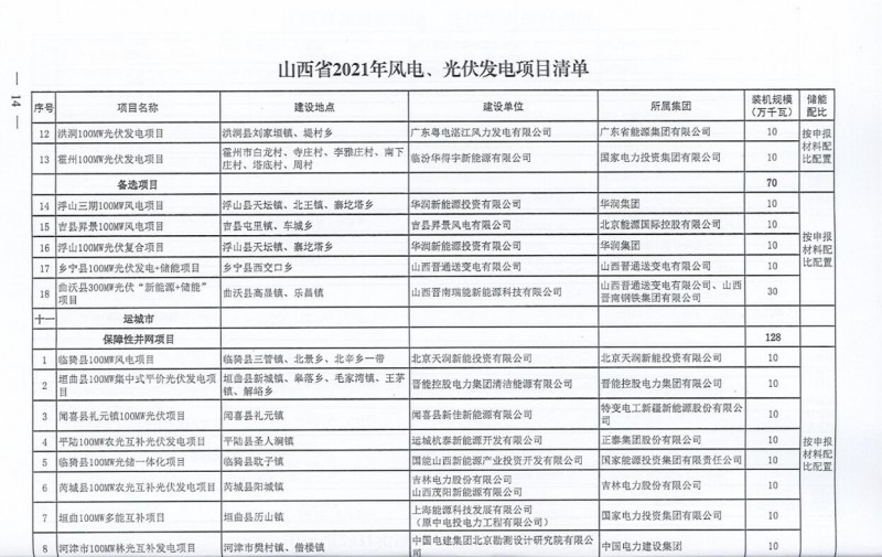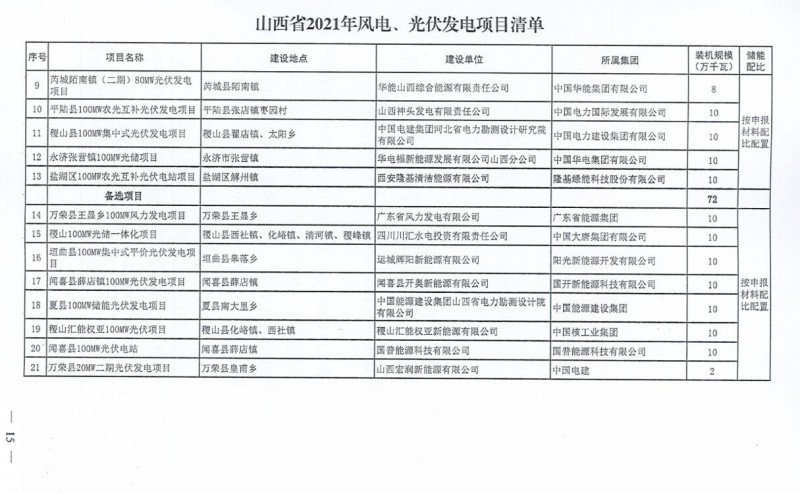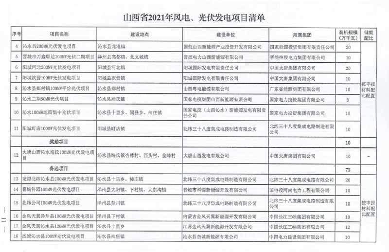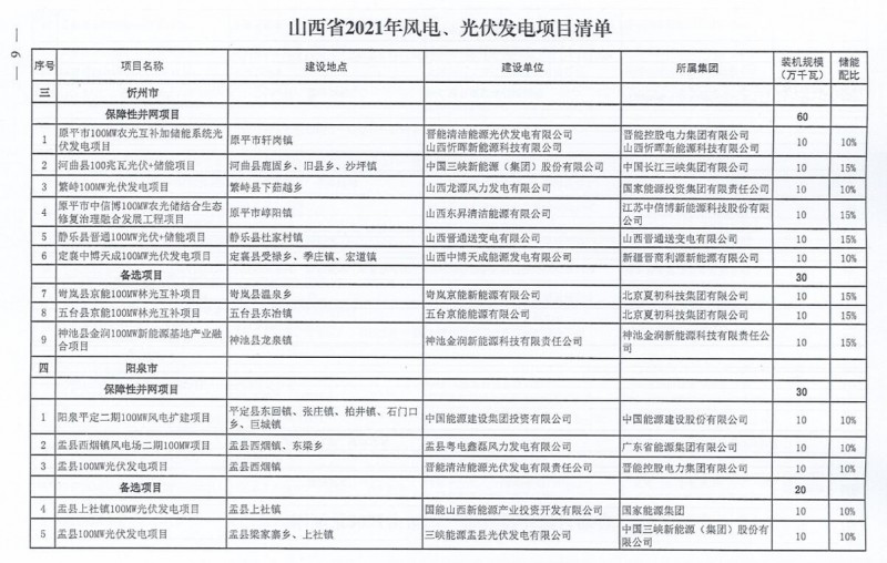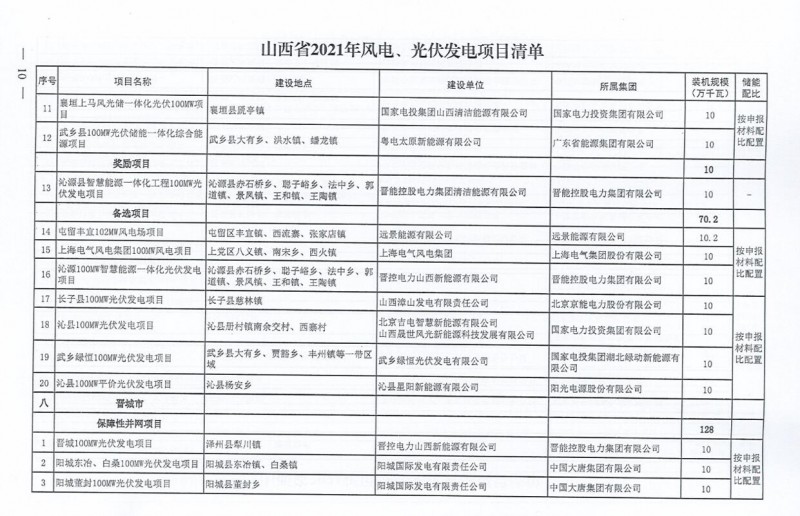 10月22日,山西省能源局下達(dá)2021年度風(fēng)電、光伏發(fā)電保障性并網(wǎng)年度建設(shè)計(jì)劃。風(fēng)、光合計(jì)17.792GW,其中保障性11.2GW+獎(jiǎng)勵(lì)700MW+備選5.892GW。文件明確保障性規(guī)模與獎(jiǎng)勵(lì)規(guī)模可同步開展前期工作,優(yōu)先保證保障性并網(wǎng)項(xiàng)目和獎(jiǎng)勵(lì)項(xiàng)目并網(wǎng),如上述項(xiàng)目未能按承諾時(shí)間并網(wǎng),將視項(xiàng)目成熟度、建設(shè)進(jìn)度和接入條件等,從備選項(xiàng)目中選擇并網(wǎng)項(xiàng)目,保障完成國家下達(dá)的最低消納責(zé)任權(quán)重。