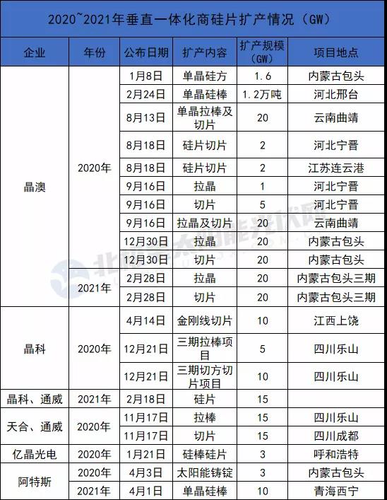 而2021年截至目前,隆基暫未公開硅片相關(guān)擴(kuò)產(chǎn)計(jì)劃,2020年其在云南新擴(kuò)70GW單晶產(chǎn)能。