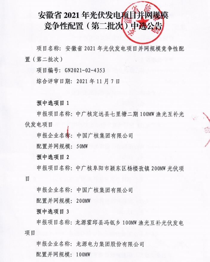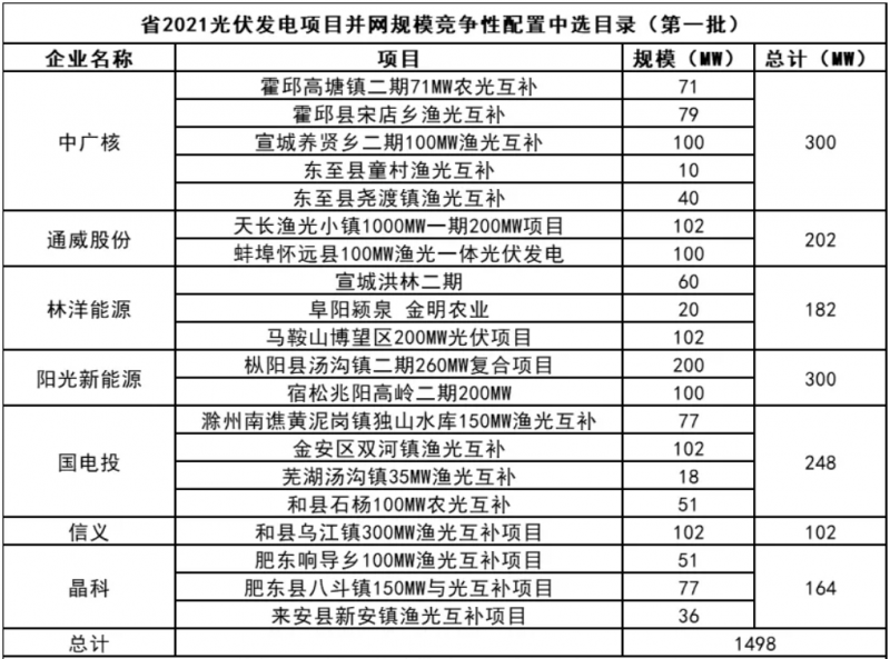 此前10月21日,安徽省能源局下發(fā)《2021年光伏發(fā)電項(xiàng)目并網(wǎng)規(guī)模競(jìng)爭(zhēng)性配置(第一批次)中選公告》,規(guī)模共計(jì)1498MW。中廣核、陽光新能源、國(guó)家電投、通威、林洋、晶科、信義光能等7家企業(yè)中標(biāo)20個(gè)光伏第一批優(yōu)選項(xiàng)目。加上此次安徽省總共公示了4GW光伏、1.166GW風(fēng)電項(xiàng)目。