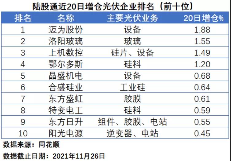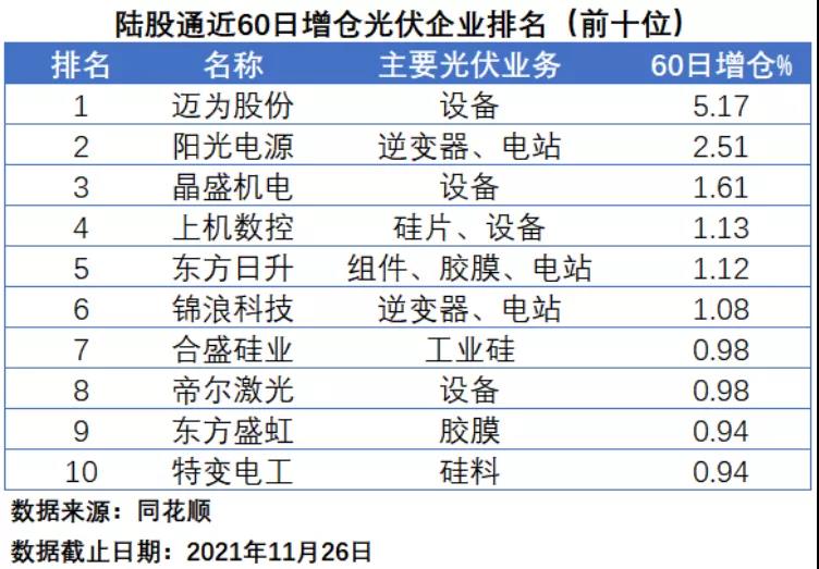 在陸股通近60日增倉排名中,邁為股份、陽光電源和晶盛機電分居前三位,增倉幅度分別為5.17%、2.51%和1.61%,其中邁為股份和晶盛機電均為光伏設(shè)備企業(yè),前者的核心產(chǎn)品為太陽能電池絲網(wǎng)印刷生產(chǎn)設(shè)備,后者主營產(chǎn)品為晶體生長設(shè)備。上機數(shù)控、東方日升、錦浪科技、合盛硅業(yè)、帝爾激光、東方盛虹和特變電工分居第四到第十位。前十名中,涉足光伏設(shè)備業(yè)務(wù)的企業(yè)高達4家,涉足電站業(yè)務(wù)的企業(yè)為3家。