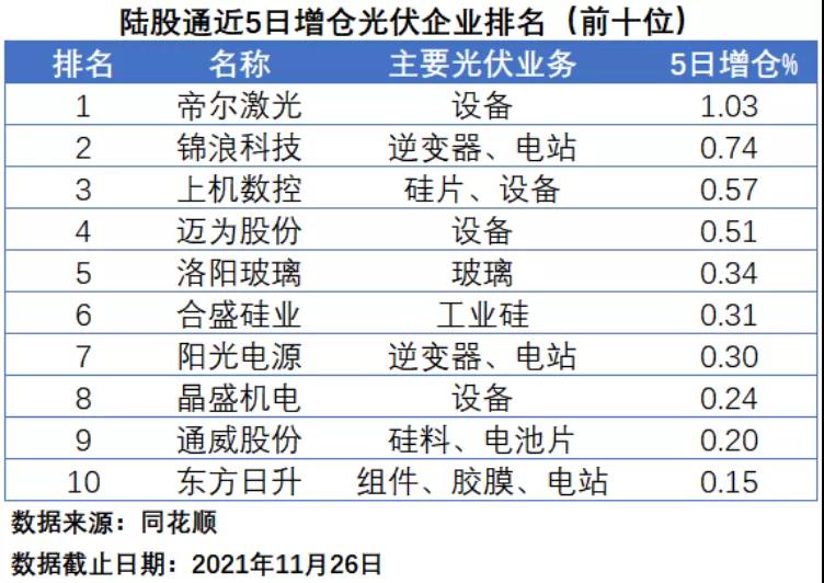 在陸股通近5日增倉排名中,電池片生產(chǎn)設(shè)備廠商帝爾激光最受“北向資金”追捧,以1.03%的增持幅度排名第一,錦浪科技、上機數(shù)控以0.74%和0.57%位居第二和第三,邁為股份、洛陽玻璃、合盛硅業(yè)、陽光電源、晶盛機電、通威股份和東方日升位居第四到第十位。前十名中,涉足光伏設(shè)備領(lǐng)域的企業(yè)數(shù)量依然為最多,達到了4家。