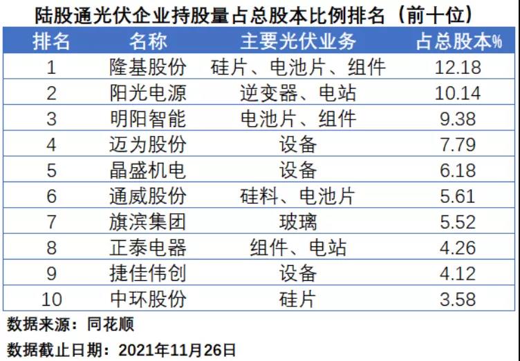 在陸股通持股量占總股本比例排名中,隆基股份以12.18%排名第一,陽光電源和明陽智能分別以10.14%和9.38%分居第二和第三位,邁為股份、晶盛機電、通威股份、旗濱集團、正泰電器、捷佳偉創(chuàng)和中環(huán)股份位居第四到第十位。值得注意的是,前十名中,光伏設(shè)備企業(yè)的數(shù)量達到3家,占比最高。在如今光伏行業(yè)產(chǎn)能規(guī)模持續(xù)提升、個別環(huán)節(jié)的技術(shù)路線仍存一定變數(shù)的情況下,景氣度較高的光伏設(shè)備領(lǐng)域頗受“北向資金”青睞。
