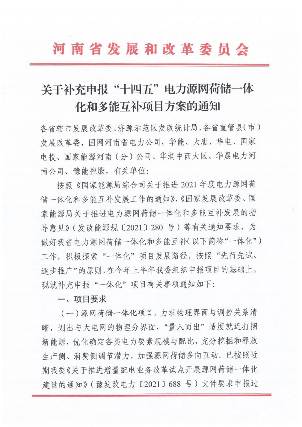 11月30日,河南省發(fā)改委發(fā)布了《關(guān)于補充申報“十四五”電力源網(wǎng)荷儲一體化和多能互補項目方案》的通知。按照“先行先試、逐步推廣”的原則,在今年上半年河南發(fā)改委組織申報項目的基礎(chǔ)上,再次補充申報“一體化”項目。