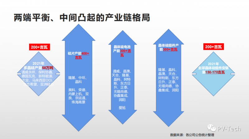 呂錦標(biāo)在報(bào)告里也公布了全球7家主要企業(yè)和4家新進(jìn)入企業(yè)的擴(kuò)產(chǎn)情況,預(yù)測(cè)2022年多晶硅供應(yīng)可以超過(guò)80萬(wàn)噸,比今年增加20萬(wàn)噸。主要產(chǎn)能集中在下半年投產(chǎn)。對(duì)應(yīng)明年200吉瓦的裝機(jī)預(yù)測(cè),多晶硅供應(yīng)大于需求。有望推動(dòng)價(jià)格下行。