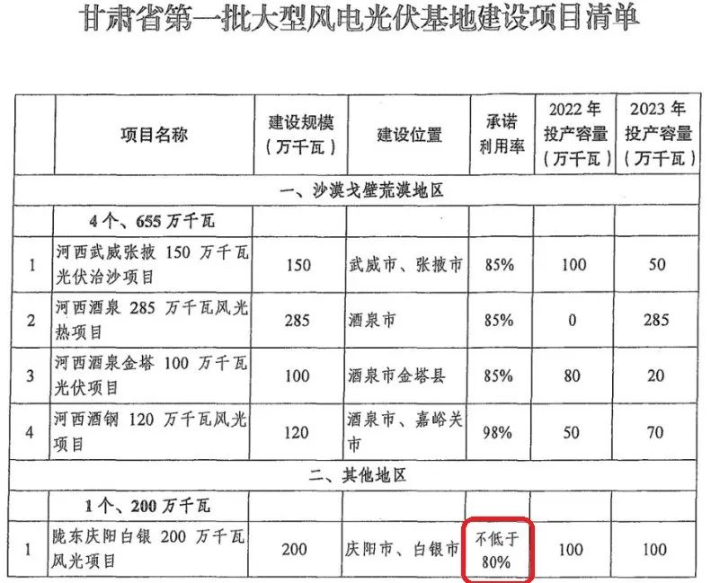 在國家能源局、國家發(fā)改委印發(fā)的《第一批以沙漠、戈壁、荒漠地區(qū)為重點的大型風(fēng)電、光伏基地建設(shè)項目清單的通知》中,青海省僅僅給出了84%的利用率承諾;而甘肅的一個基地,甚至只敢承諾80%!
