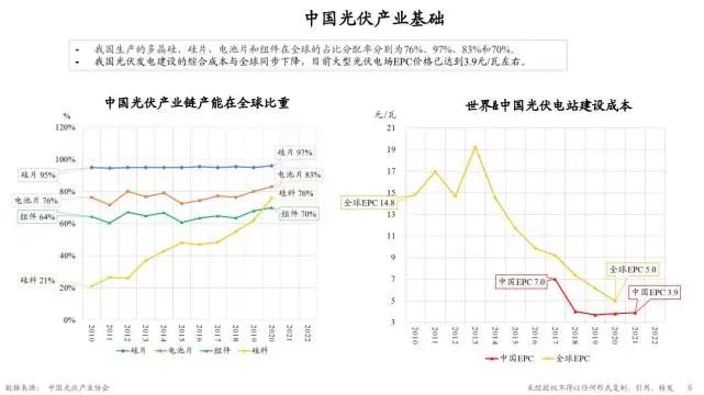 同時可以看一下中國的光伏產(chǎn)業(yè)基礎(chǔ)。從下面的左圖可以看出來,中國光伏產(chǎn)業(yè)鏈的各個環(huán)節(jié)在全球占據(jù)了很大的比重,包括硅料的生產(chǎn)也是在迅速提升??从疫呥@張圖,中國光伏電站建設(shè)成本也是系統(tǒng)性下降,同時顯著低于全球的成本水平。