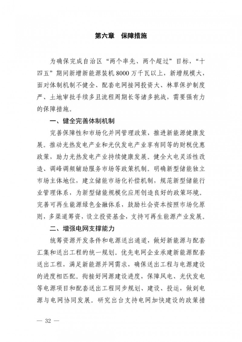 可再生能源發(fā)電目標(biāo)。自治區(qū)可再生能源發(fā)電裝機(jī)達(dá)到 1.35 億千瓦以上,其中風(fēng)電 8900 萬千瓦、光伏發(fā)電 4500 萬千瓦,新能源裝機(jī)規(guī)模超過燃煤火電裝機(jī)規(guī)模,新能源發(fā)電量占自治區(qū)總發(fā)電量比重超過35%。“十四五”期間可再生能源新增裝機(jī) 8000 萬千瓦以上,占全部新增裝機(jī)的比重超過 60%,成為新增裝機(jī)的主力。