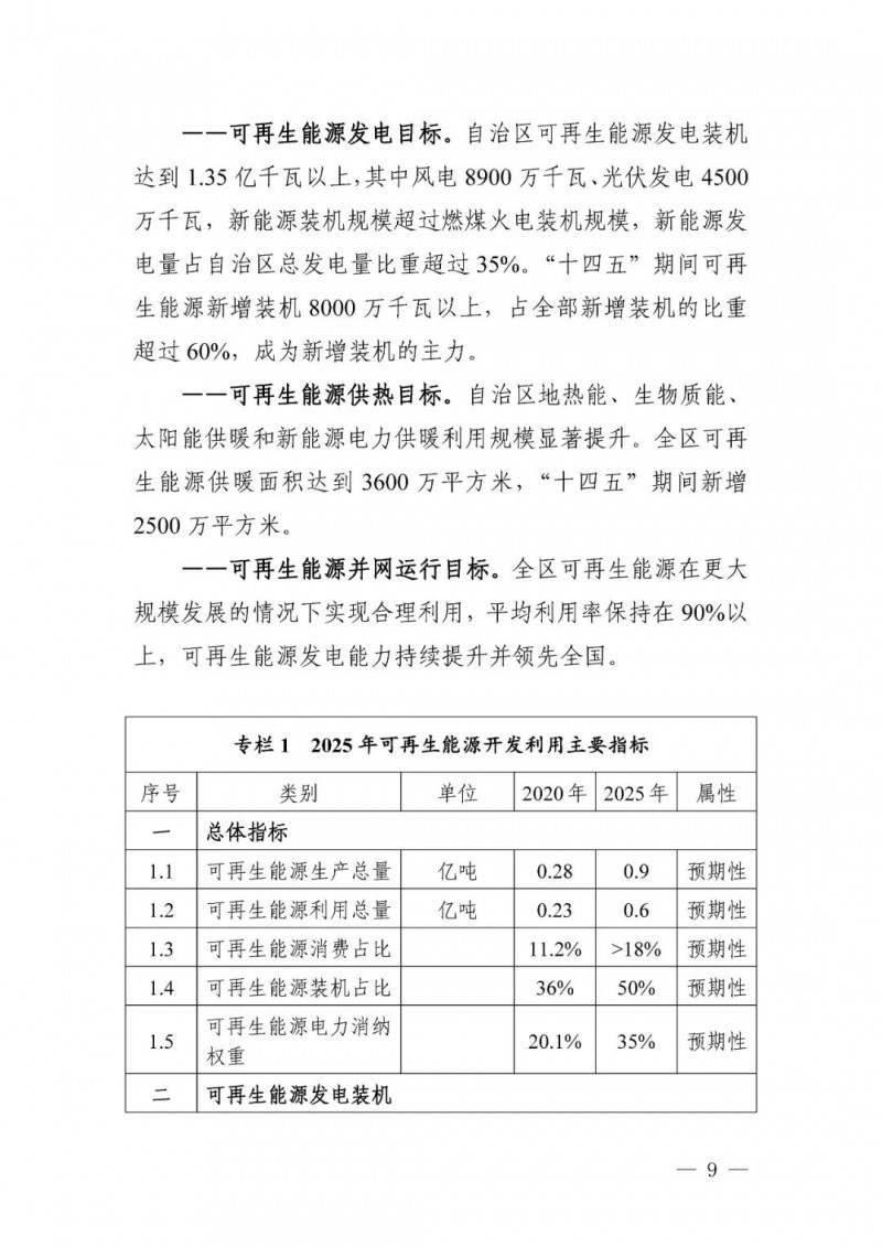 可再生能源總量目標(biāo)。至2025 年,自治區(qū)可再生能源生產(chǎn)總量超過 9000萬噸標(biāo)準(zhǔn)煤,可再生能源區(qū)內(nèi)利用量超過6000萬噸標(biāo)準(zhǔn)煤,占當(dāng)年一次能源消費(fèi)總量的18%以上,超過全國(guó)平均水平。