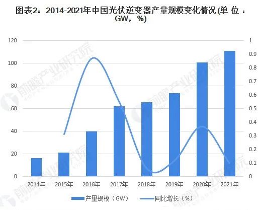 隨著國(guó)內(nèi)外光伏發(fā)電行業(yè)的快速發(fā)展,中國(guó)光伏逆變器產(chǎn)量由2014年的16.3GW增加至2020年超過(guò)100GW,年均復(fù)合增速超過(guò)35%。2021年,全國(guó)光伏發(fā)電新增裝機(jī)同比增長(zhǎng)了10%,國(guó)內(nèi)企業(yè)也加大光伏逆變器生產(chǎn)布局,帶動(dòng)光伏逆變器產(chǎn)量進(jìn)一步增長(zhǎng)。