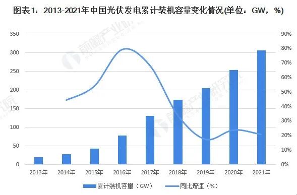 據(jù)國(guó)家能源局統(tǒng)計(jì)數(shù)據(jù)顯示,2013年以來(lái),我國(guó)光伏發(fā)電累計(jì)裝機(jī)容量增長(zhǎng)迅速。2013年,全國(guó)光伏發(fā)電累計(jì)裝機(jī)容量?jī)H為19.42GW,到2021年累計(jì)突破300GW,連續(xù)7年穩(wěn)居全球首位。