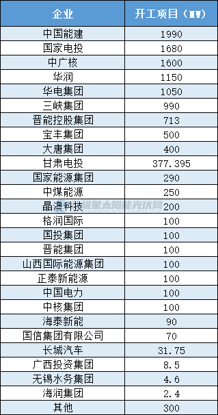 從項(xiàng)目建設(shè)單位來看,除了五大四小發(fā)電集團(tuán)外,地方國企、事業(yè)單位、民營光伏開發(fā)商均在積極開發(fā)建設(shè)光伏項(xiàng)目。其中,中國能建、國家電投、中廣核、華潤、華電開工項(xiàng)目規(guī)模均超1GW以上;三峽集團(tuán)、晉能控股、寶豐集團(tuán)開工項(xiàng)目規(guī)模均在500MW及以上。