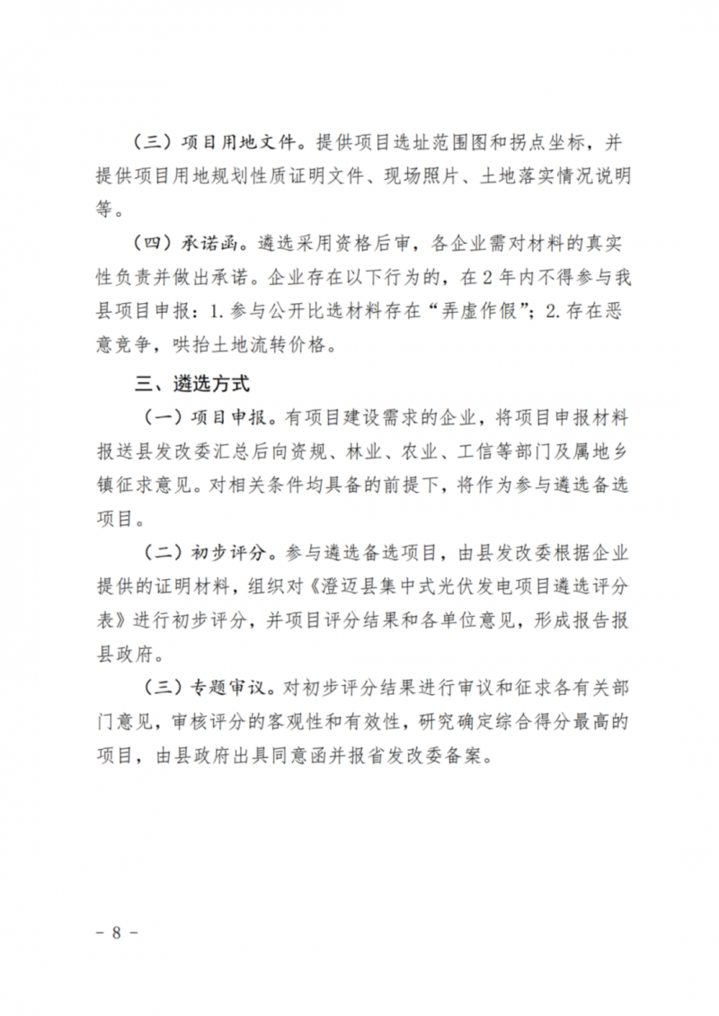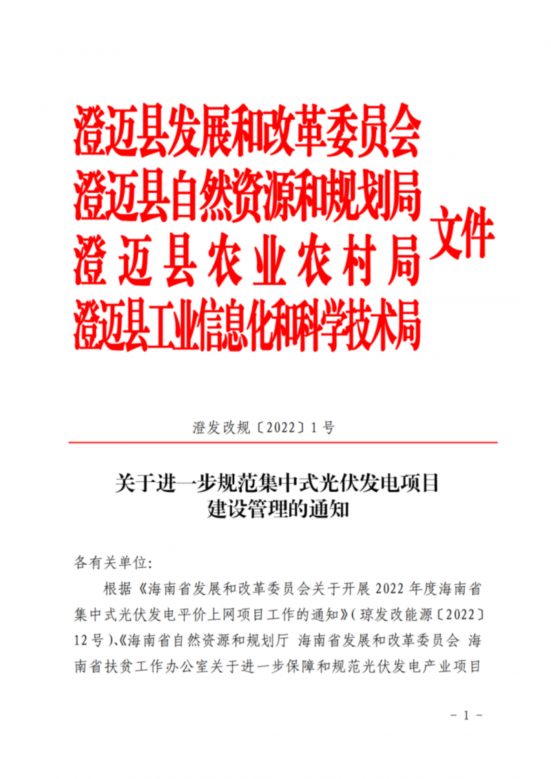 4月11日,澄邁縣發(fā)展和改革委員會、澄邁縣自然資源和規(guī)劃局、澄邁縣農(nóng)業(yè)農(nóng)村局、澄邁縣工業(yè)信息化和科學(xué)技術(shù)局聯(lián)合發(fā)布了《關(guān)于進一步規(guī)范集中式光伏發(fā)電項目建設(shè)管理的通知》。本通知自2022年5月12日起施行,有效期2年。