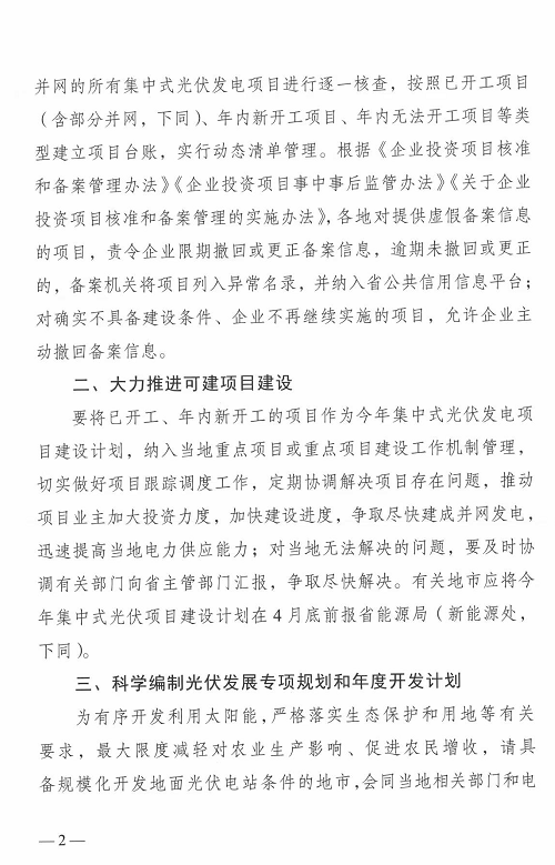 2.大力推進(jìn)可建項目建設(shè):要將已開工、年內(nèi)新開工的項目作為今年集中式光伏發(fā)電項目建設(shè)計劃,納入當(dāng)?shù)刂攸c項目或重點項目建設(shè)工作機制管理,