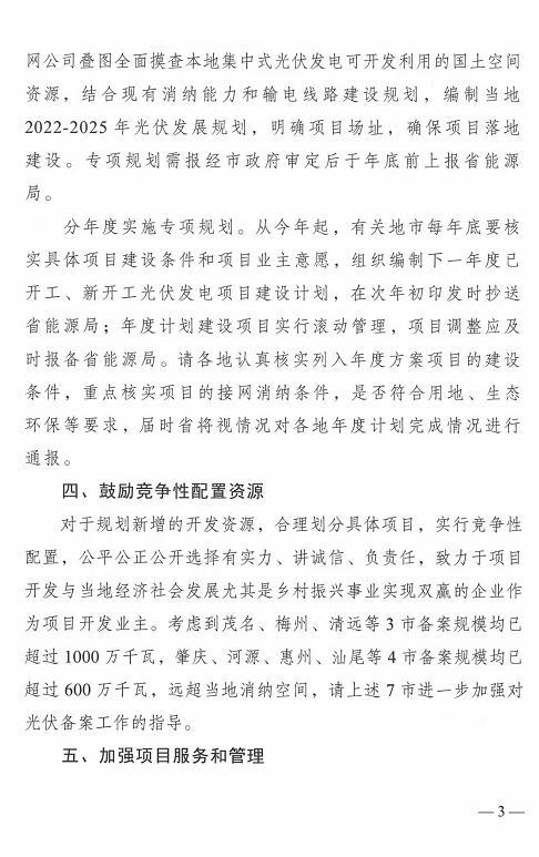 4.鼓勵競爭性配置資源:考慮到茂名、梅州、清遠(yuǎn)等3市備案規(guī)模均已超過1000萬千瓦,肇慶、河源、惠州、汕尾等4市備案規(guī)模均已超過600萬千瓦,遠(yuǎn)超當(dāng)?shù)叵{空間,請上述7市進(jìn)一步加強對光伏備案工作的指導(dǎo)。
