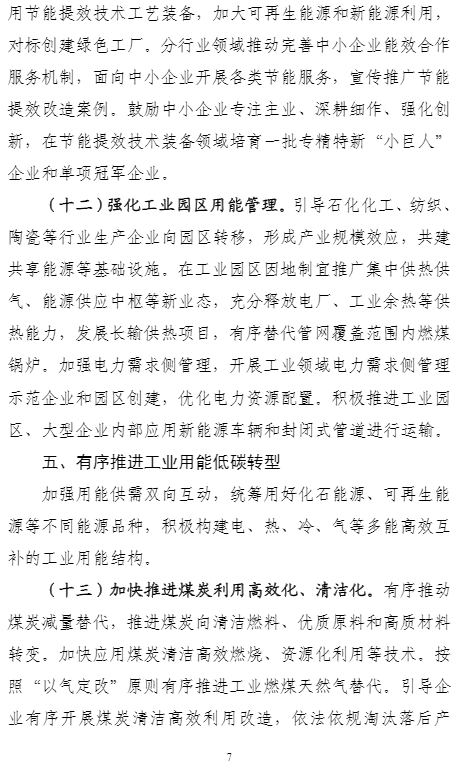 加快推進煤炭利用高效化、清潔化。有序推動煤炭減量替代,推進煤炭向清潔燃料、優(yōu)質(zhì)原料和高質(zhì)材料轉(zhuǎn)變。加快應(yīng)用煤炭清潔高效燃燒、資源化利用等技術(shù)。按照“以氣定改”原則有序推進工業(yè)燃煤天然氣替代。引導(dǎo)企業(yè)有序開展煤炭清潔高效利用改造,依法依規(guī)淘汰落后產(chǎn)能、落后工藝。