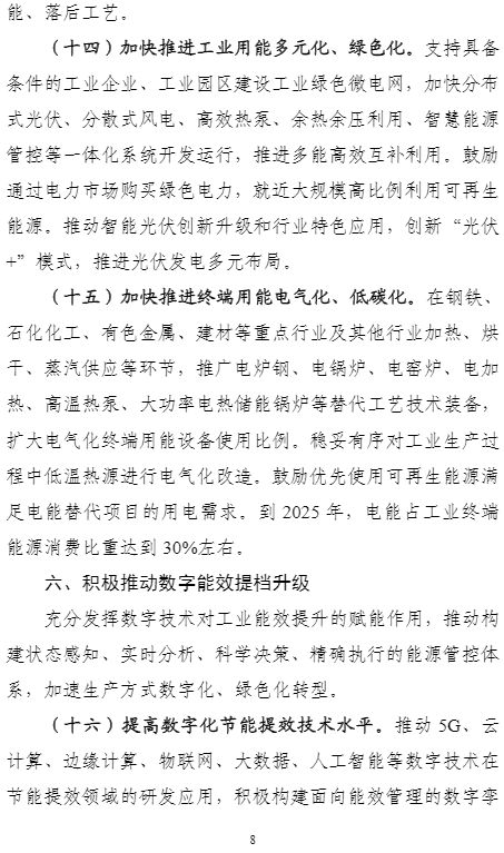 加快推進終端用能電氣化、低碳化。在鋼鐵、石化化工、有色金屬、建材等重點行業(yè)及其他行業(yè)加熱、烘干、蒸汽供應(yīng)等環(huán)節(jié),推廣電爐鋼、電鍋爐、電窯爐、電加熱、高溫?zé)岜?、大功率電熱儲能鍋爐等替代工藝技術(shù)裝備,擴大電氣化終端用能設(shè)備使用比例。穩(wěn)妥有序?qū)I(yè)生產(chǎn)過程中低溫?zé)嵩催M行電氣化改造。鼓勵優(yōu)先使用可再生能源滿足電能替代項目的用電需求。到2025年,電能占工業(yè)終端能源消費比重達到30%左右。