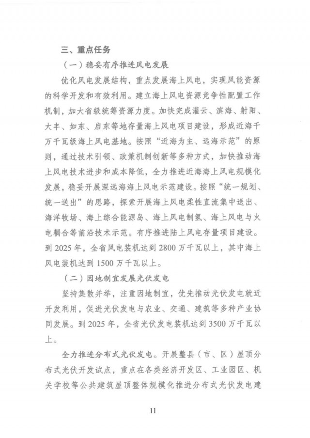 ● 擴大可再生能源裝機規(guī)模:到2025年,全省可再生能源裝機力爭達到6600萬千瓦以上,省內可再生能源裝機占總裝機比重超過34%。其中,風電裝機達到2800萬千瓦以 上,光伏發(fā)電裝機達到 3500 萬千瓦以上,生物質發(fā)電裝機達到300萬千瓦以上,另外,抽水蓄能裝機達到328萬千瓦 以上,實現(xiàn)電力裝機結構有新跨越。