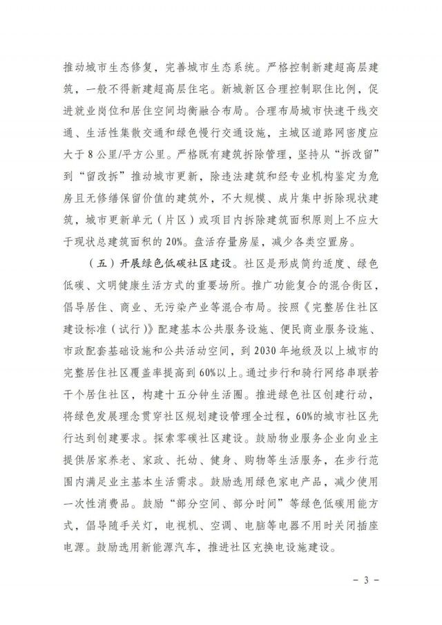 《方案》提出開展綠色低碳社區(qū)建設(shè)。推廣功能復(fù)合的混合街區(qū),倡導(dǎo)居住、商業(yè)、無(wú)污染產(chǎn)業(yè)等混合布局。按照《完整居住社區(qū)建設(shè)標(biāo)準(zhǔn)(試行)》配建基本公共服務(wù)設(shè)施、便民商業(yè)服務(wù)設(shè)施、市政配套基礎(chǔ)設(shè)施和公共活動(dòng)空間,到2030年地級(jí)及以上城市的完整居住社區(qū)覆蓋率提高到60%以上。通過(guò)步行和騎行網(wǎng)絡(luò)串聯(lián)若干個(gè)居住社區(qū),構(gòu)建十五分鐘生活圈。推進(jìn)綠色社區(qū)創(chuàng)建行動(dòng),將綠色發(fā)展理念貫穿社區(qū)規(guī)劃建設(shè)管理全過(guò)程,60%的城市社區(qū)先行達(dá)到創(chuàng)建要求。探索零碳社區(qū)建設(shè)。鼓勵(lì)物業(yè)服務(wù)企業(yè)向業(yè)主提供居家養(yǎng)老、家政、托幼、健身、購(gòu)物等生活服務(wù),在步行范圍內(nèi)滿足業(yè)主基本生活需求。鼓勵(lì)選用綠色家電產(chǎn)品,減少使用一次性消費(fèi)品。鼓勵(lì)“部分空間、部分時(shí)間”等綠色低碳用能方式,倡導(dǎo)隨手關(guān)燈,電視機(jī)、空調(diào)、電腦等電器不用時(shí)關(guān)閉插座電源。鼓勵(lì)選用新能源汽車,推進(jìn)社區(qū)充換電設(shè)施建設(shè)。