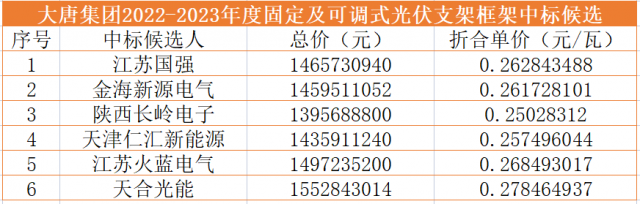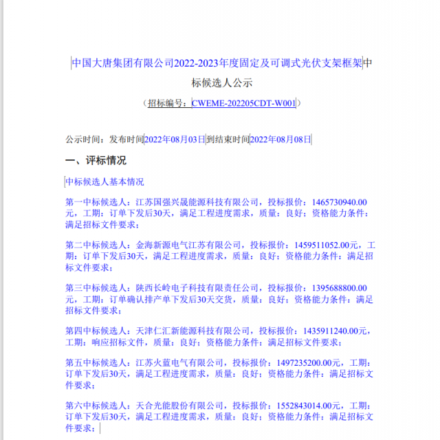 8月3日,大唐集團(tuán)公示了2022-2023年度固定及可調(diào)式光伏支架框架中標(biāo)候選人,江蘇國(guó)強(qiáng)興晟能源、金海新源電氣、陜西長(zhǎng)嶺電子科技、天津仁匯新能源、江蘇火藍(lán)電氣、天合光能6家光伏支架供應(yīng)商入圍。