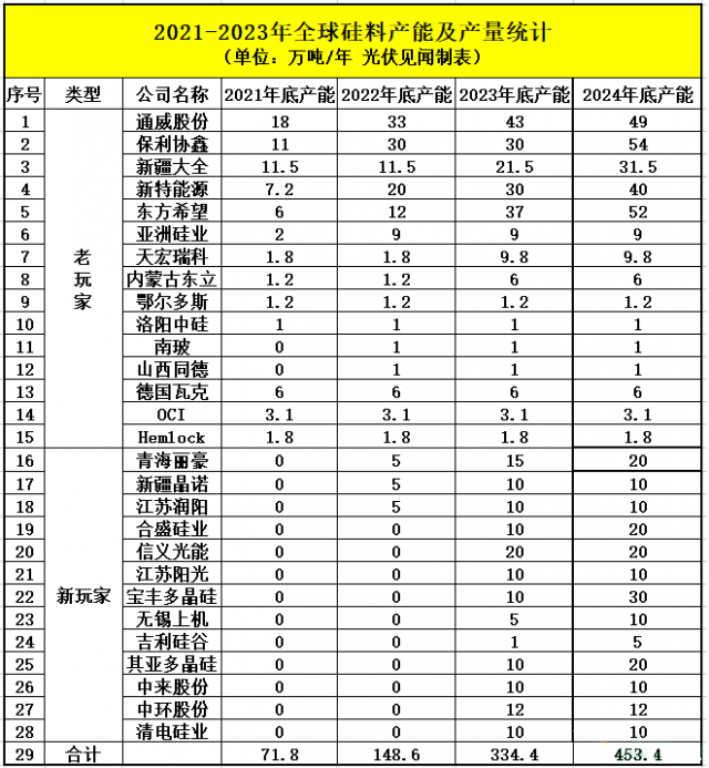 2021年以來(lái),硅料老玩家大舉擴(kuò)產(chǎn),新玩家實(shí)力雄厚如過(guò)江之鯽,這一輪硅料牛市涌現(xiàn)了將近30家硅料企業(yè)。光伏見(jiàn)聞根據(jù)公開(kāi)消息不完全統(tǒng)計(jì),2022年底,硅料企業(yè)新老玩家產(chǎn)能將達(dá)到148.6萬(wàn)噸,2023年底,硅料企業(yè)產(chǎn)能則將達(dá)到334.4萬(wàn)噸,如果產(chǎn)能完全釋放,保守估計(jì)這些硅料可生產(chǎn)的組件則分別為505GW、1136GW。