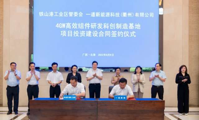 6月9日,一道新能簽約北海市投資建設(shè)的10GW高效組件研發(fā)科創(chuàng)制造基地項(xiàng)目,其中一期4GW高效組件研發(fā)科創(chuàng)制造基地項(xiàng)目將建設(shè)6條光伏組件生產(chǎn)線。