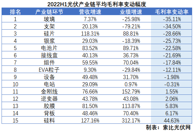 結合產(chǎn)業(yè)鏈來看,玻璃環(huán)節(jié)隨著去年一季度末新增產(chǎn)能的投產(chǎn),產(chǎn)品價格相較于去年同期大幅下滑,導致毛利率平均降幅高達35.11%。PV Infolink數(shù)據(jù)顯示,2022年上半年光伏玻璃3.2mm鍍膜和2.0mm鍍膜平均價格較去年同期分別下滑18%和23%。