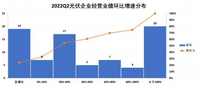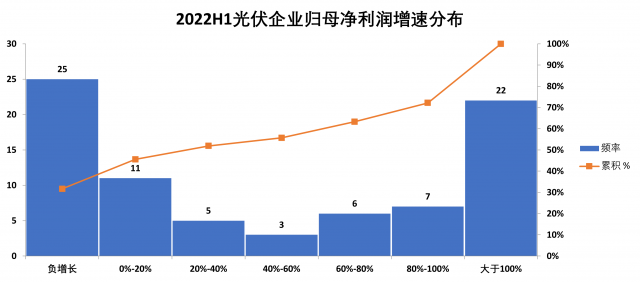 相比于營收的普漲態(tài)勢,光伏企業(yè)的經(jīng)營業(yè)績卻出現(xiàn)顯著分化。2022年上半年,79家光伏企業(yè)的歸母凈利潤總額達到650億元,平均增速為32%。其中,利潤負增長的企業(yè)占比高達32%,而業(yè)績翻倍增長的企業(yè)占比亦達到28%,呈現(xiàn)顯著的“兩極分化”態(tài)勢。不過,與2021年不同的是,產(chǎn)業(yè)鏈中游的諸多專業(yè)化廠商紛紛迎來“困境反轉”,而業(yè)績出現(xiàn)下滑的企業(yè)多為競爭力一般的中小市值企業(yè)。