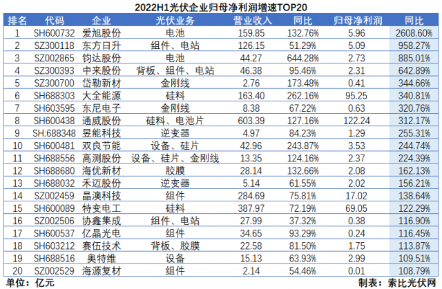 利潤增速方面,除了硅料企業(yè)延續(xù)高增長以外,去年因硅料價格暴漲而出現(xiàn)虧損的產(chǎn)業(yè)鏈中游專業(yè)化廠商,2022年上半年受益于供應鏈管理能力的提升以及產(chǎn)品結構的優(yōu)化,紛紛迎來困境翻轉,其中愛旭股份、東方日升、中來股份的利潤增速分別達到2609%、958%和643%。此外,岱勒新材、東尼電子兩大金剛線廠商受益于硅片環(huán)節(jié)的擴產(chǎn)以及細線化發(fā)展趨勢,疊加自身的產(chǎn)能擴張和成本下降,利潤增速均超300%。