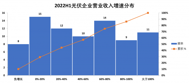 2022年上半年,79家光伏企業(yè)合計創(chuàng)收5571億元,平均增速(“平均”指“中位數(shù)”,下同)達到48%。令人欣喜的是,營收負增長的企業(yè)占比僅為10%,而營收增速超過40%的企業(yè)占比則高達71%。其中,除了硅料企業(yè)繼續(xù)保持高速增長以外,眾多“跨界者”也乘著光伏行業(yè)的“東風”,迎來暴發(fā)式增長。