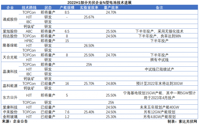 除了盈利能力以及經(jīng)營業(yè)績顯著改善以外,電池片環(huán)節(jié)的N型電池技術變革也成為了時下業(yè)界以及資本市場關注的焦點。2022年上半年,TOPCon、HJT乃至鈣鈦礦等電池片概念成為A股市場炒作的熱點,期間更是誕生了寶馨科技、京山輕機、金剛玻璃等一眾“妖股”。而在中報中,各大龍頭企業(yè)也重點披露了N型電池技術的進展情況。