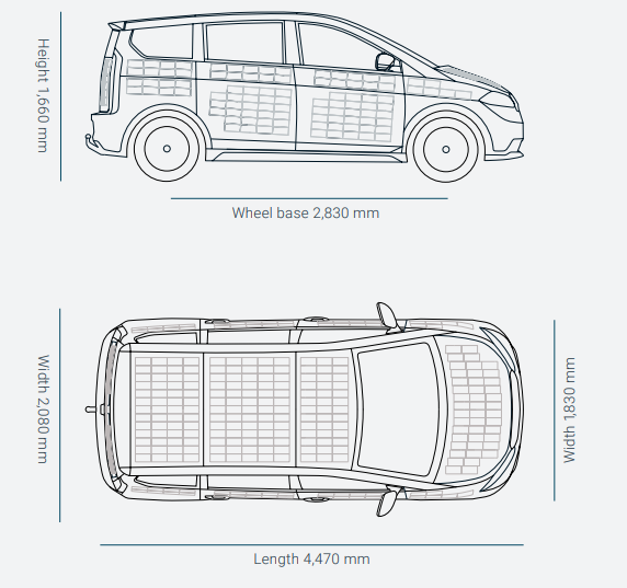 Sion配置了一個(gè)54 kWh的LFP電池組。電池并不大。但是這款車還有后招來(lái)確保續(xù)航里程。Sion的發(fā)動(dòng)機(jī)罩,擋泥板,側(cè)面,車頂和車輛后部裝有太陽(yáng)能電池。456個(gè)太陽(yáng)能半電池和整個(gè)車身融合。這就是這款車的特別之處。Sono Motors表示這些半電池每周可增加112-245公里的續(xù)航里程。平均每天可以增加16-35公里。Sono Motors表示,如果這款車在德國(guó)市區(qū)使用,充電量是同一細(xì)分市場(chǎng)的傳統(tǒng)電動(dòng)汽車的四分之一。