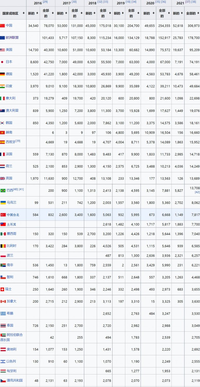 國(guó)際可再生能源署2021年度世界各國(guó)光伏裝機(jī)統(tǒng)計(jì)(單位:MW)