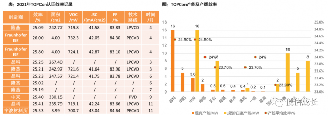 TOPCon:已有29GW在產,22年規(guī)劃超40GW,龍頭量產平均效率24.5%。