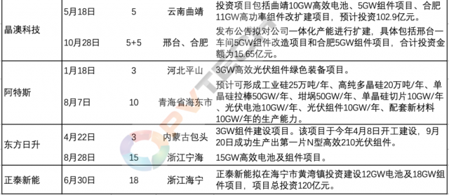 今年以來(lái),以晶科能源、隆基綠能、天合光能、晶澳科技等為代表的行業(yè)第一梯隊(duì)主流組件大廠為鞏固各自市場(chǎng)地位、把握行業(yè)發(fā)展帶來(lái)的市場(chǎng)機(jī)遇,均在積極投資新建組件產(chǎn)能。