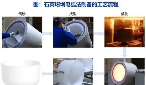 電弧法是制備石英坩堝的主流制備技術(shù)。將高純的石英砂原料倒入坩堝模具內(nèi),通過成型裝置將石英砂原料均勻的成型在模具的內(nèi)表面以成型坩堝坯,然后將坩堝模具整體移入電弧熔制爐內(nèi),通過石墨電極釋放高溫電弧使石英砂熔化,最后快速冷卻形成石英坩堝毛坯。石英坩堝分為內(nèi)層透明層、中層氣泡復合層和外層薄氣泡層,各層質(zhì)量占比分別為25%-70%、20%-40%和5%-30%,通常比例為4:3:4或者3:4:3。