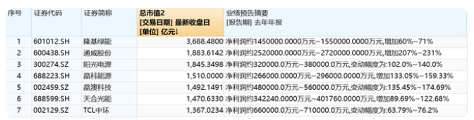 上游利潤全年稱王,但Q4增速明顯分化7家千億光伏股,隆基綠能(601012.SH)、通威股份(600438.SH)、陽光電源(300274.SZ)、晶澳科技(002459.SZ)、晶科能源(688223.SH)、天合光能(688599.SH)、TCL中環(huán)(002129.SZ)2022年業(yè)績均為預(yù)增。