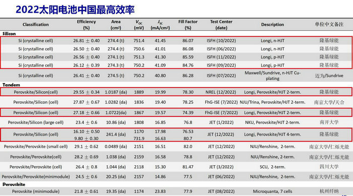 2022太陽電池中國最高效率發(fā)布,隆基綠能共有7個(gè)電池效率入選,占此次效率結(jié)果發(fā)布的近1/2。