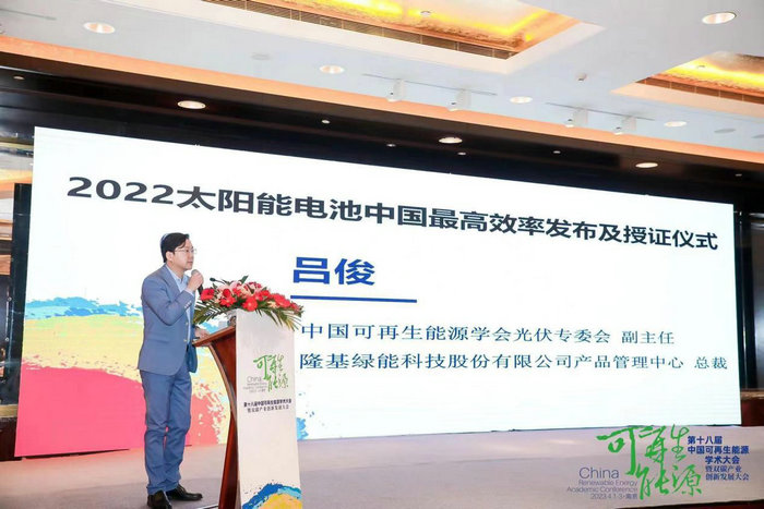 中國可再生能源學(xué)會(huì)光伏專委會(huì)副主任、隆基綠能產(chǎn)品管理中心總裁呂俊博士進(jìn)行《2022太陽電池中國最高效率》發(fā)布。
