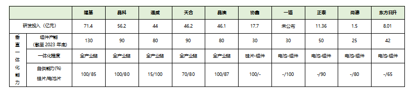 長期高強度的研發(fā)投入是科研實力長期引領(lǐng)的良性循環(huán)指標(biāo)。據(jù)上半年中標(biāo)規(guī)模TOP10企業(yè)2022年年報數(shù)據(jù)所示,企業(yè)年研發(fā)投入占營收的比例均約為5.44%,而排名TOP5的企業(yè)已與第二梯隊形成代際差。由于龍頭企業(yè)具備成本優(yōu)勢、資源優(yōu)勢和整合優(yōu)勢,相較于行業(yè)內(nèi)其它企業(yè)更具競爭力。對于技術(shù)研發(fā)和擴產(chǎn)的強勢布局,是龍頭企業(yè)戰(zhàn)略性的判斷和對技術(shù)領(lǐng)先的自信,亦是龍頭企業(yè)未來應(yīng)對產(chǎn)業(yè)爆發(fā)的交付儲備,垂直一體化自供能力達(dá)到80%的企業(yè)則具有更好的交付保障能力。