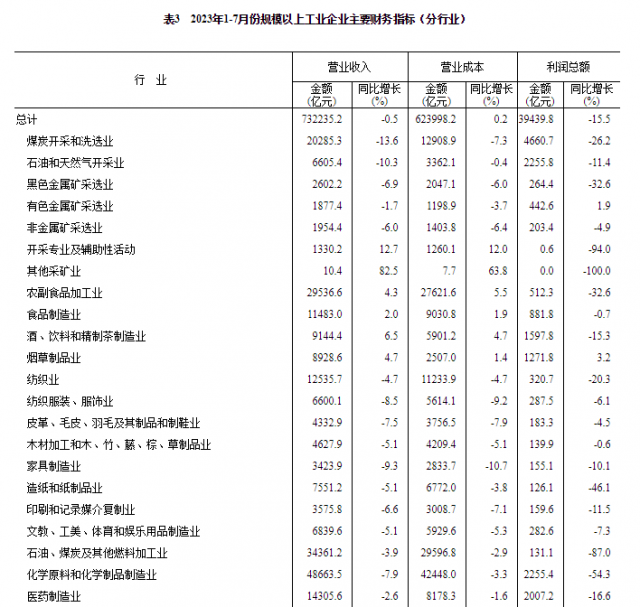 1—7月份,全國規(guī)模以上工業(yè)企業(yè)實現(xiàn)利潤總額39439.8億元,同比下降15.5%,降幅比1—6月份收窄1.3個百分點。