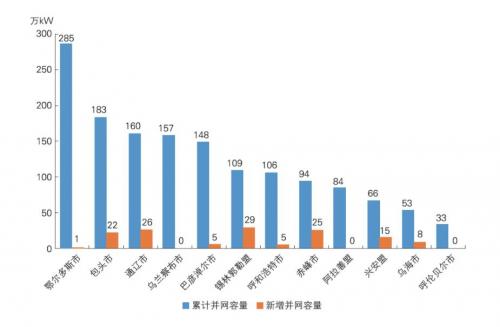 2022年,內(nèi)蒙古自治區(qū)太陽能發(fā)電新增并網(wǎng)裝機容量為156萬千瓦。截至2022年底,內(nèi)蒙古自治區(qū)太陽能發(fā)電累計并網(wǎng)裝機容量達到1558萬千瓦(不含10萬千瓦光熱項目),同比增長11.1%,太陽能發(fā)電累計并網(wǎng)裝機容量居全國第十二位,約占全部電源總裝機容量的9.2%。分盟(市)看,內(nèi)蒙古自治區(qū)太陽能發(fā)電裝機主要集中在鄂爾多斯市、包頭市、通遼市、烏蘭察布市、巴彥淖爾市、錫林郭勒盟、呼和浩特市等7個盟(市),2022年底累計并網(wǎng)裝機容量均超過100萬千瓦。