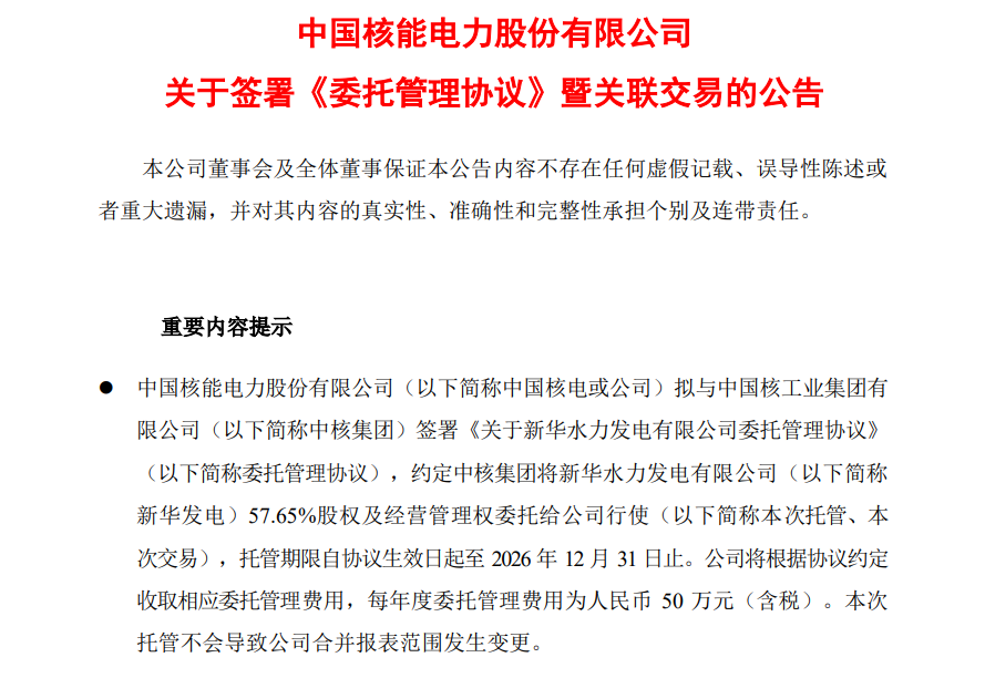 中國核電將根據(jù)協(xié)議約定收取相應委托管理費用,每年度委托管理費用為人民幣50萬元(含稅)。本次托管不會導致中國核電合并報表范圍發(fā)生變更。至此,中核集團所屬的兩大非核清潔能源投資平臺——中核匯能和新華發(fā)電,正式“合體”。